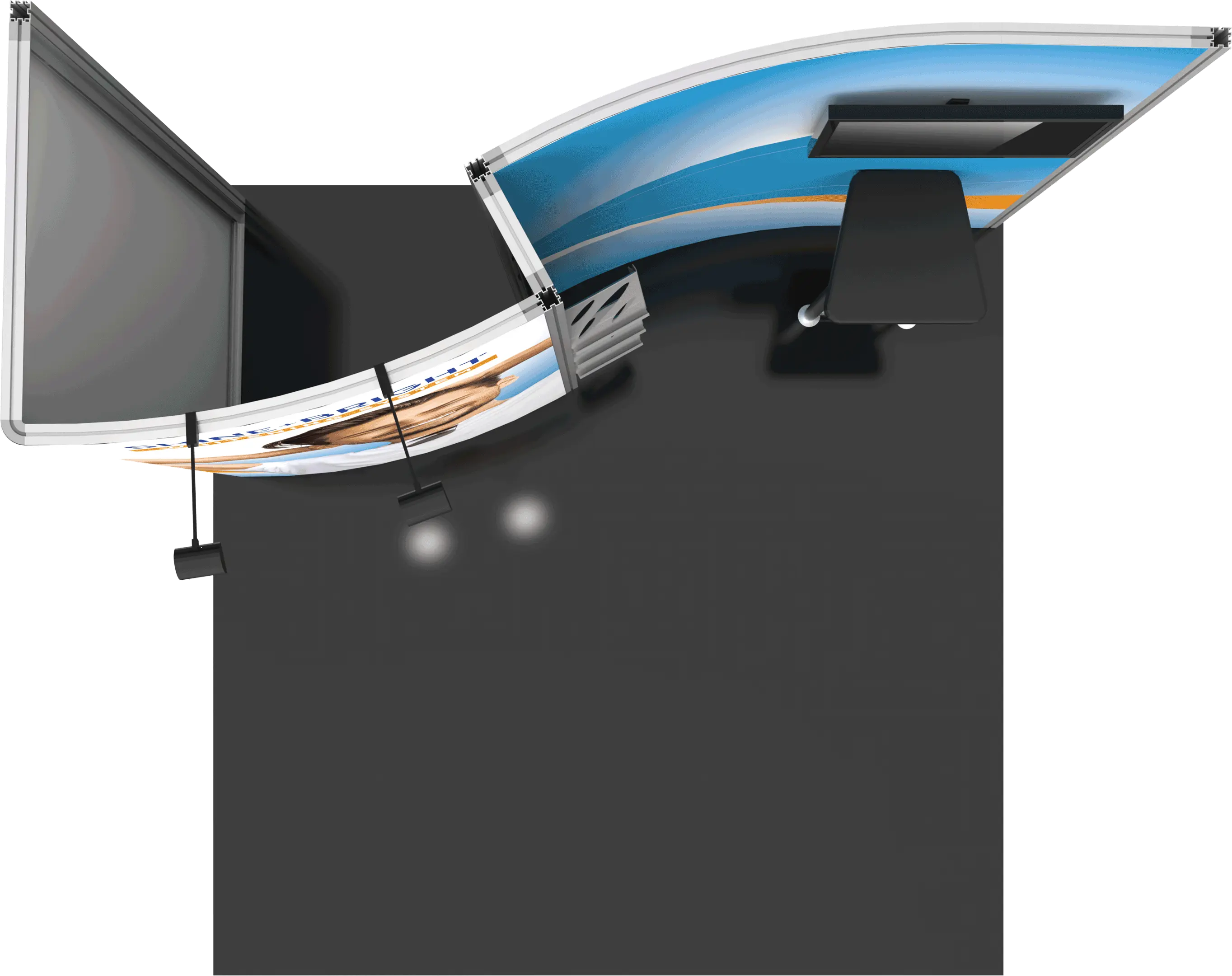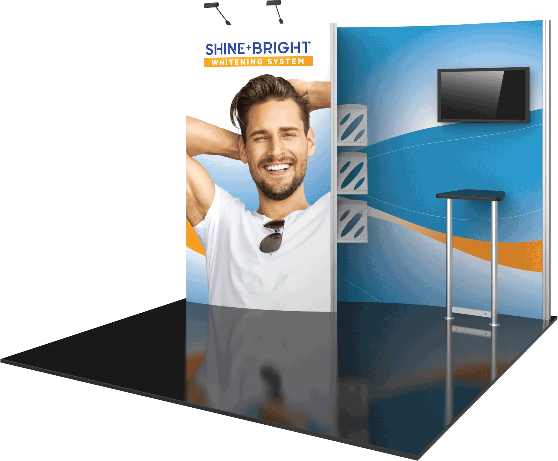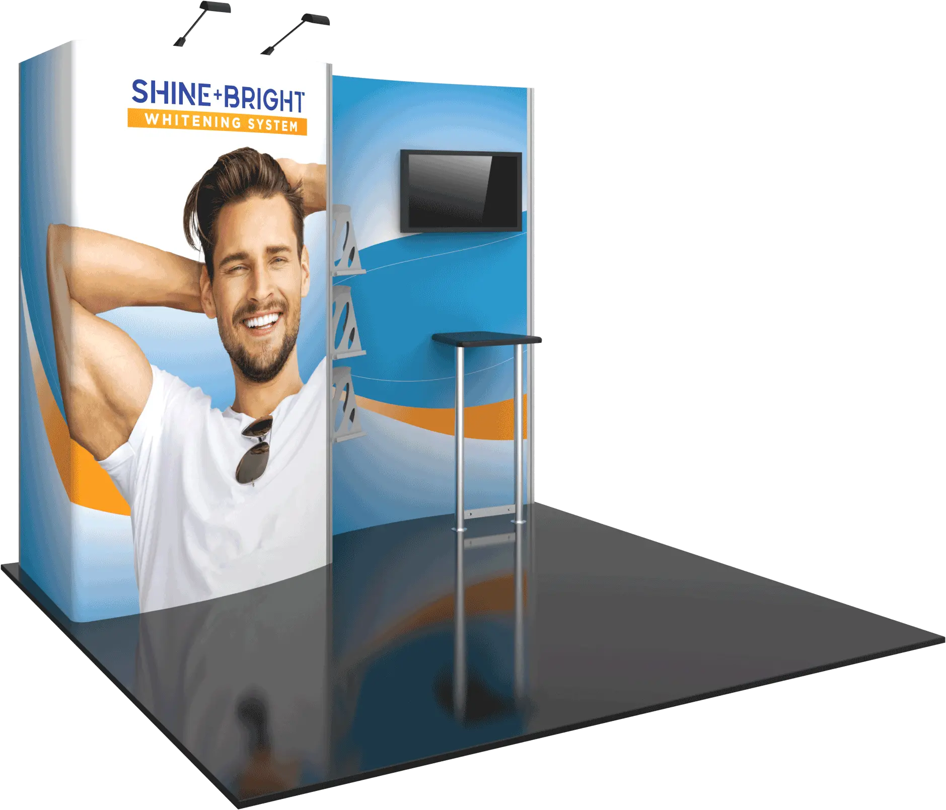 Hybrid Pro™ Modular Kit 02 is an off-the-shelf 10ft x 10ft display kit that creates a stunning display solution. Kit 02 features a monitor mount, literature racks, back wall tables and LED display lighting, combined with durable aluminum frames and high quality graphics. Customize with additional elements to create a truly remarkable display that leaves a lasting impact.