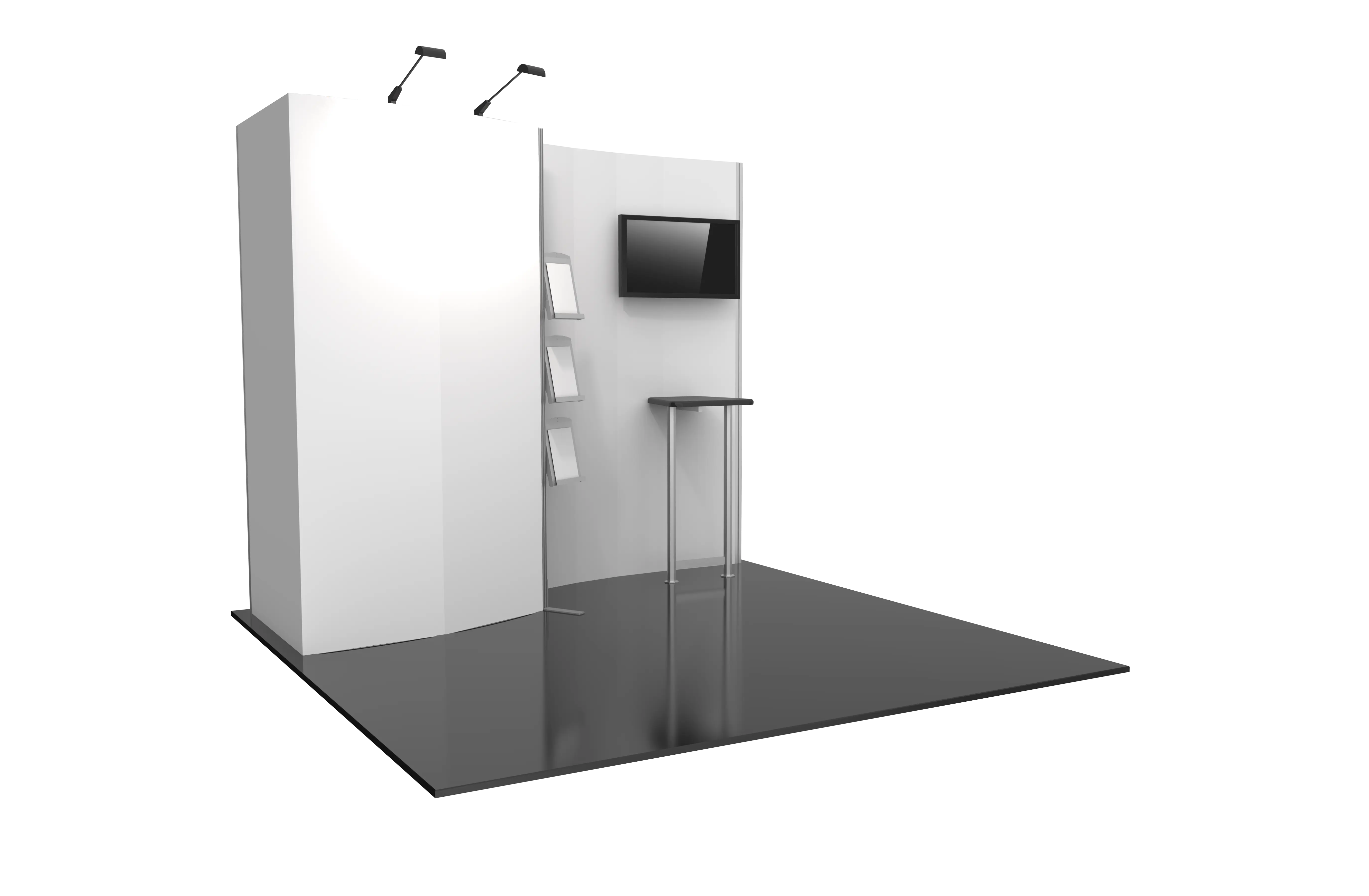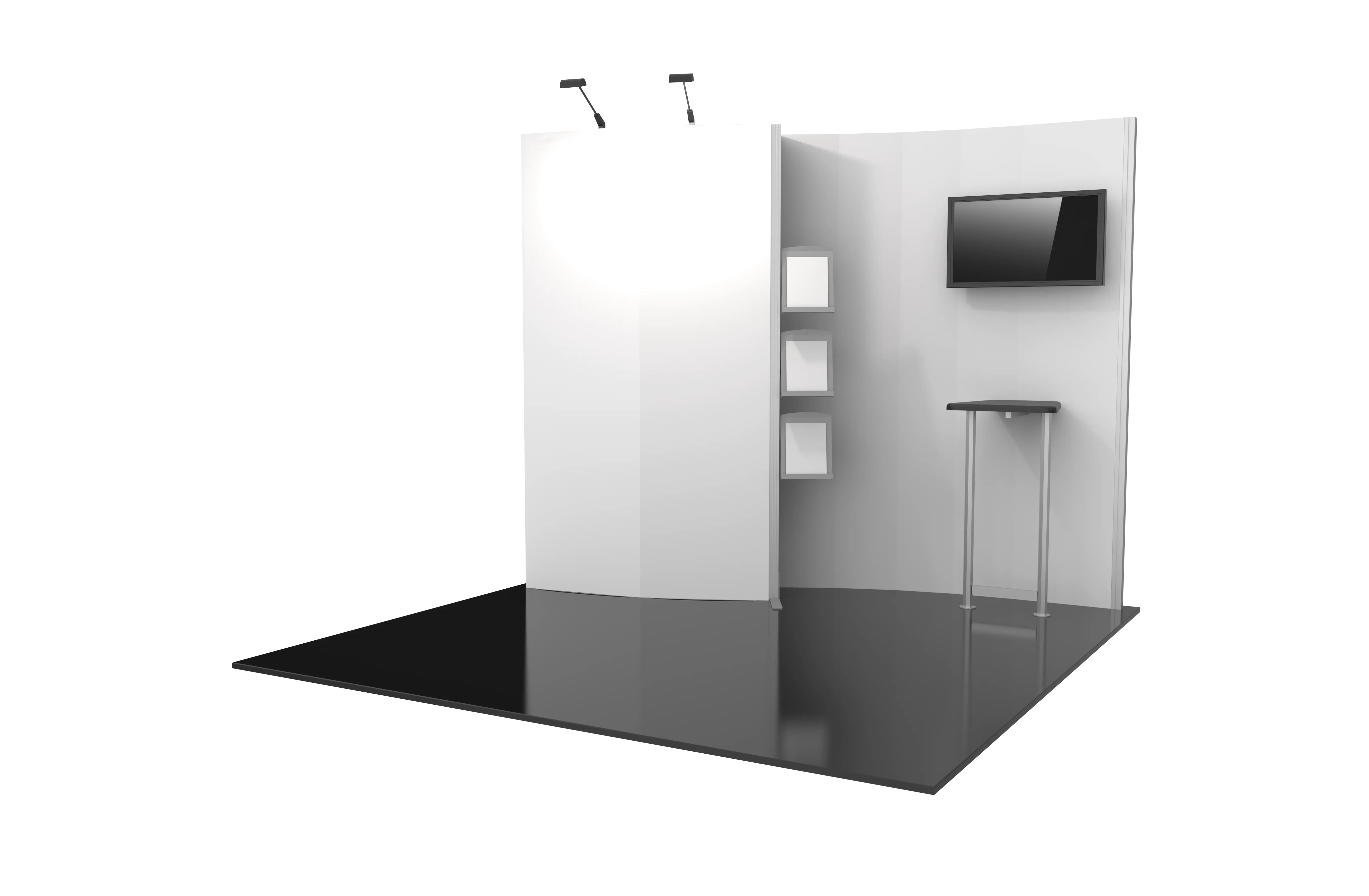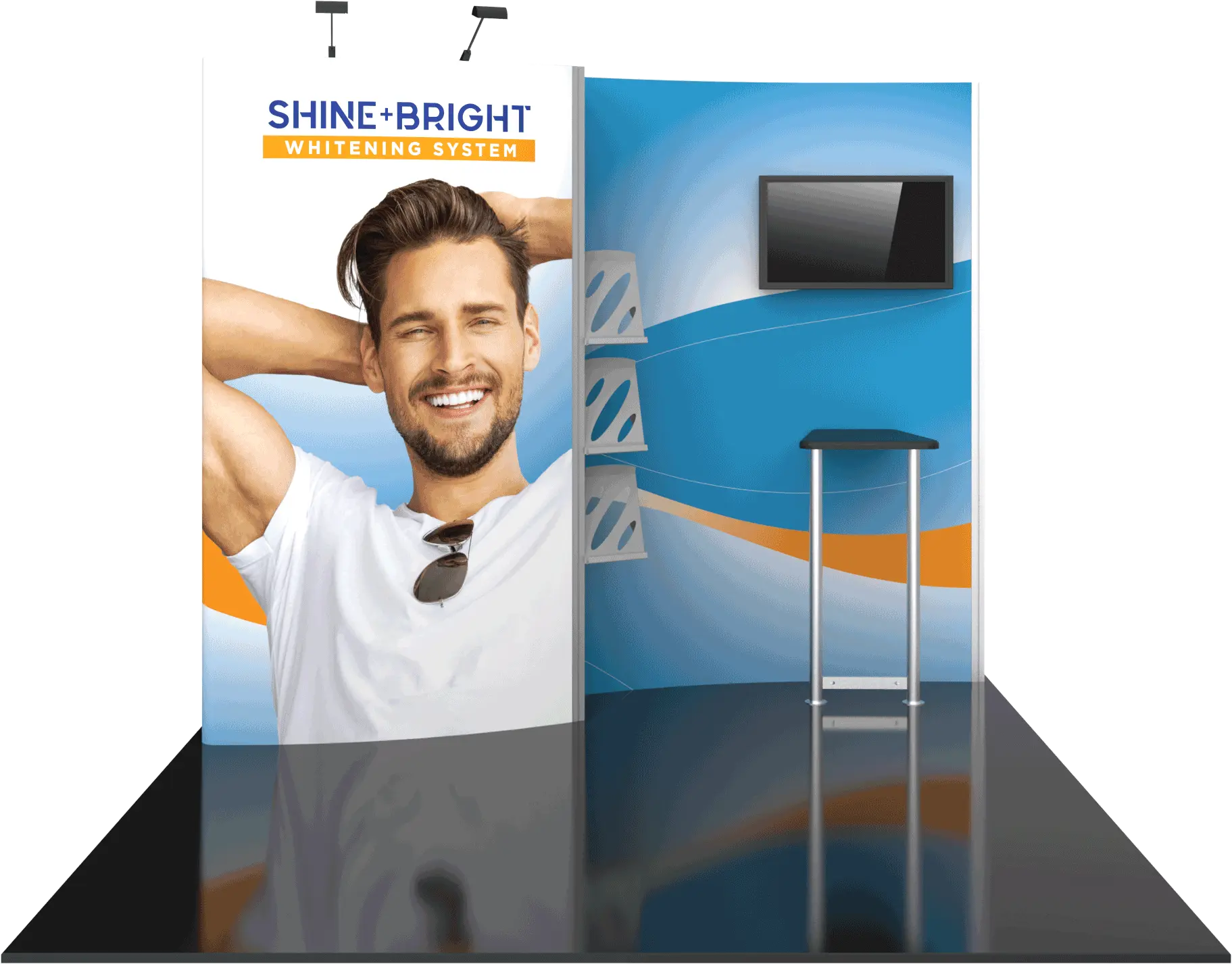 Hybrid Pro™ Modular Kit 02 is an off-the-shelf 10ft x 10ft display kit that creates a stunning display solution. Kit 02 features a monitor mount, literature racks, back wall tables and LED display lighting, combined with durable aluminum frames and high quality graphics. Customize with additional elements to create a truly remarkable display that leaves a lasting impact.