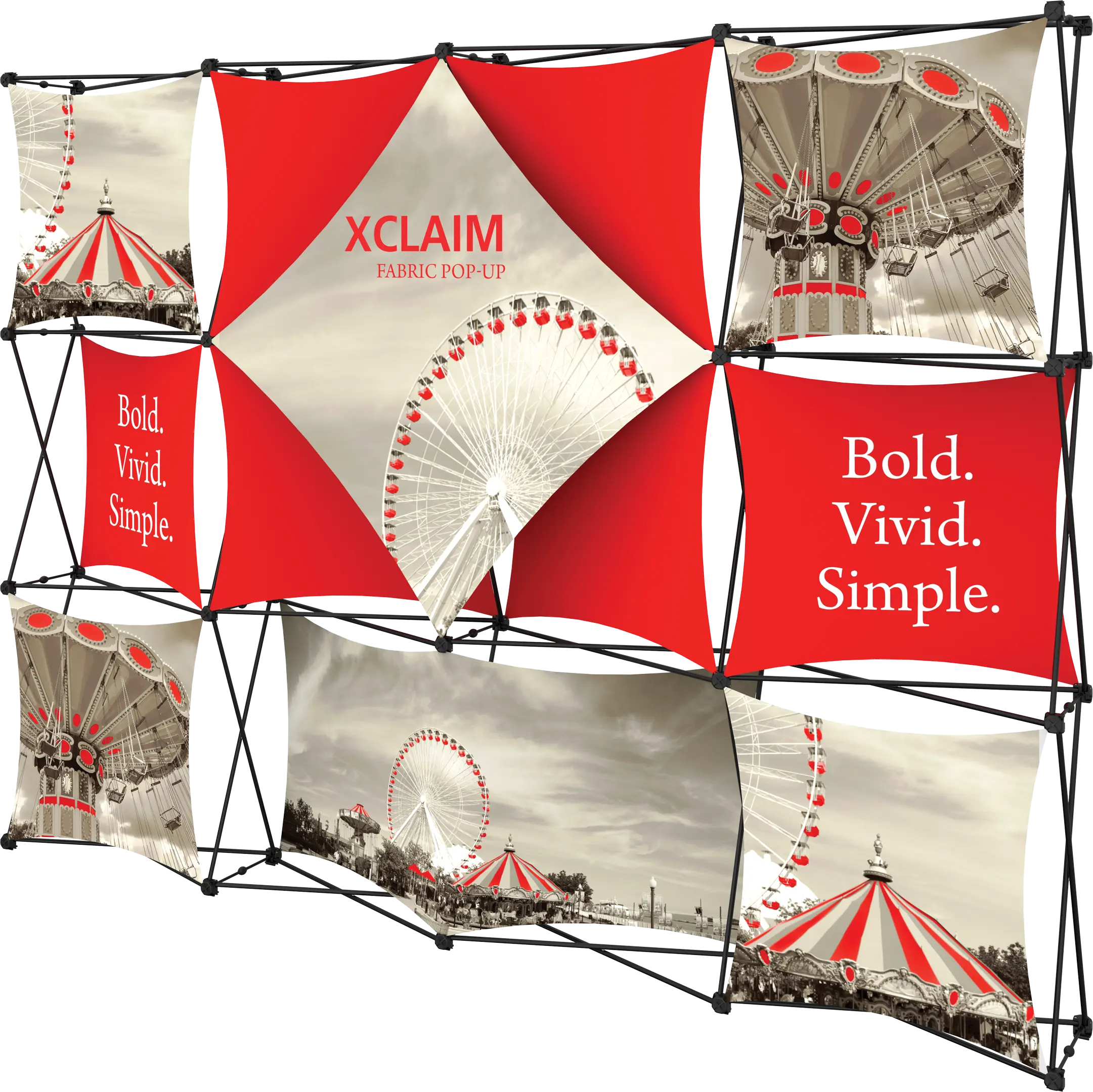 Xclaim 10ft wide (4 Quad x 3 Quad) Kit 06 is a versatile stretch fabric popup display. Add dimension to your event or tradeshow with unique, exciting graphic styles. Xclaim 10ft wide (4 Quad x 3 Quad) Kit 06 is easy to setup, lightweight and portable. The collapsible popup frame is fully magnetic (with magnetic linking connectors), making it simple to assemble and disassemble. Stretch fabric graphics come pre-attached to the frame, making assembly easy and fast. Graphics adhere to the hubs using push-fit attachment technology. Xclaim 10ft wide (4 Quad x 3 Quad) Kit 06 comes with graphics, frame and soft case with a shoulder strap.